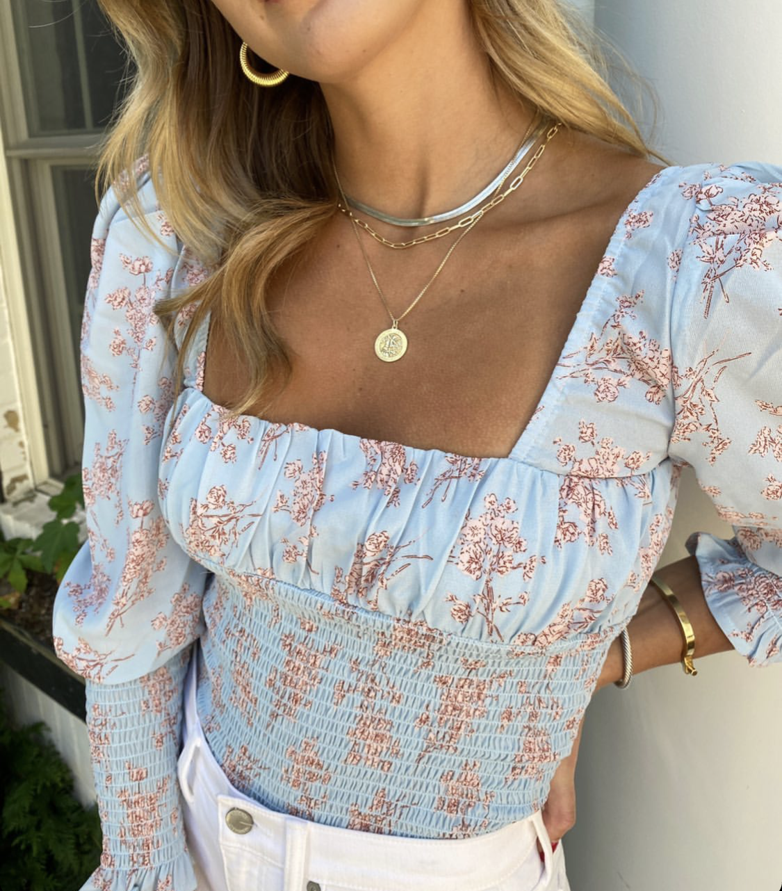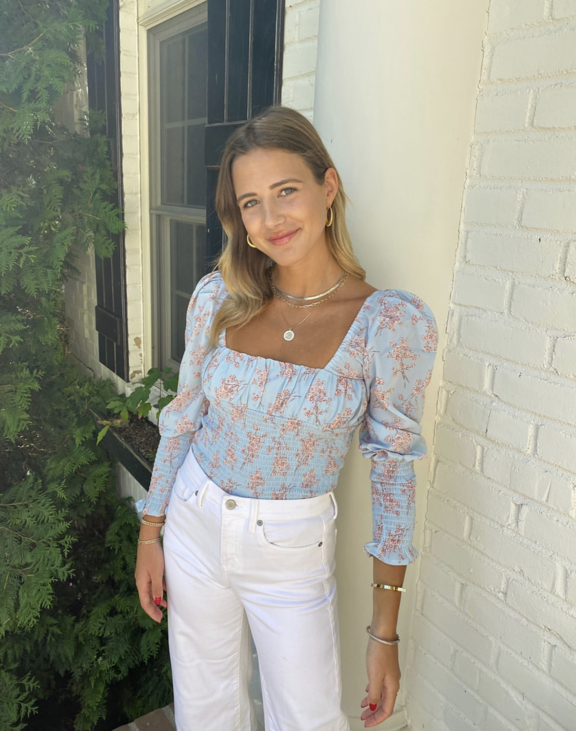 A smocked bodice and airy puff sleeves give a feminine feel to this floral blouse.