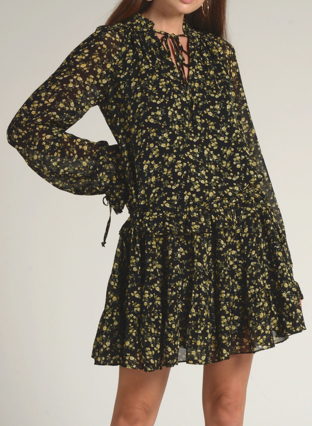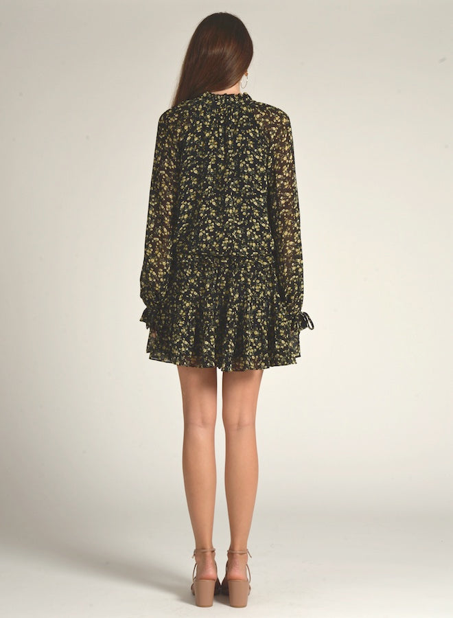 Soft ruffles and a ditsy floral print throughout creates a summer-ready look to this peasant dress