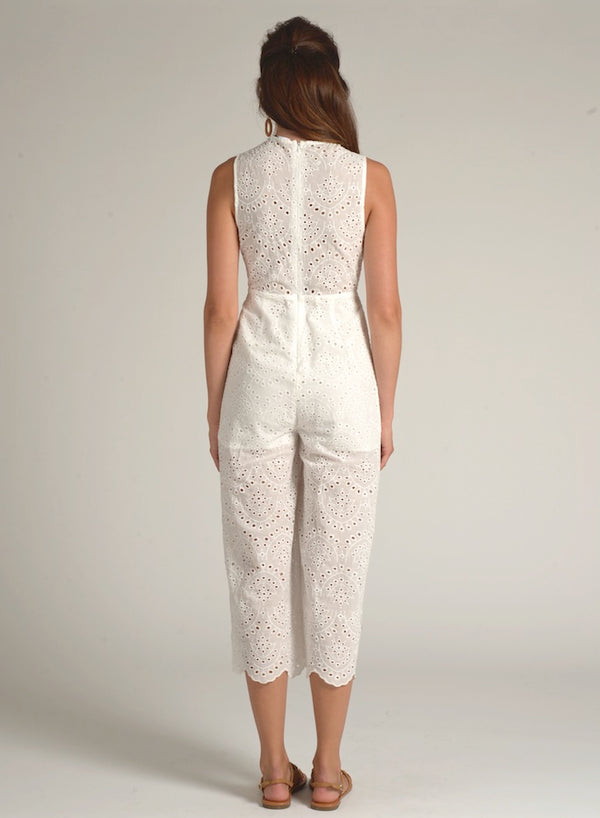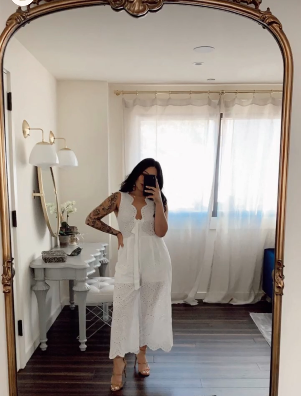 DETAILS Flirty eyelet detailed jumpsuit with a tie front. Scalloped V-neck neckline No sleeve Tie Front Invisible zipper closure Partially lined Cotton Gentle machine wash Imported SIZE & FIT Model is wearing US size Small True to size Please check...
